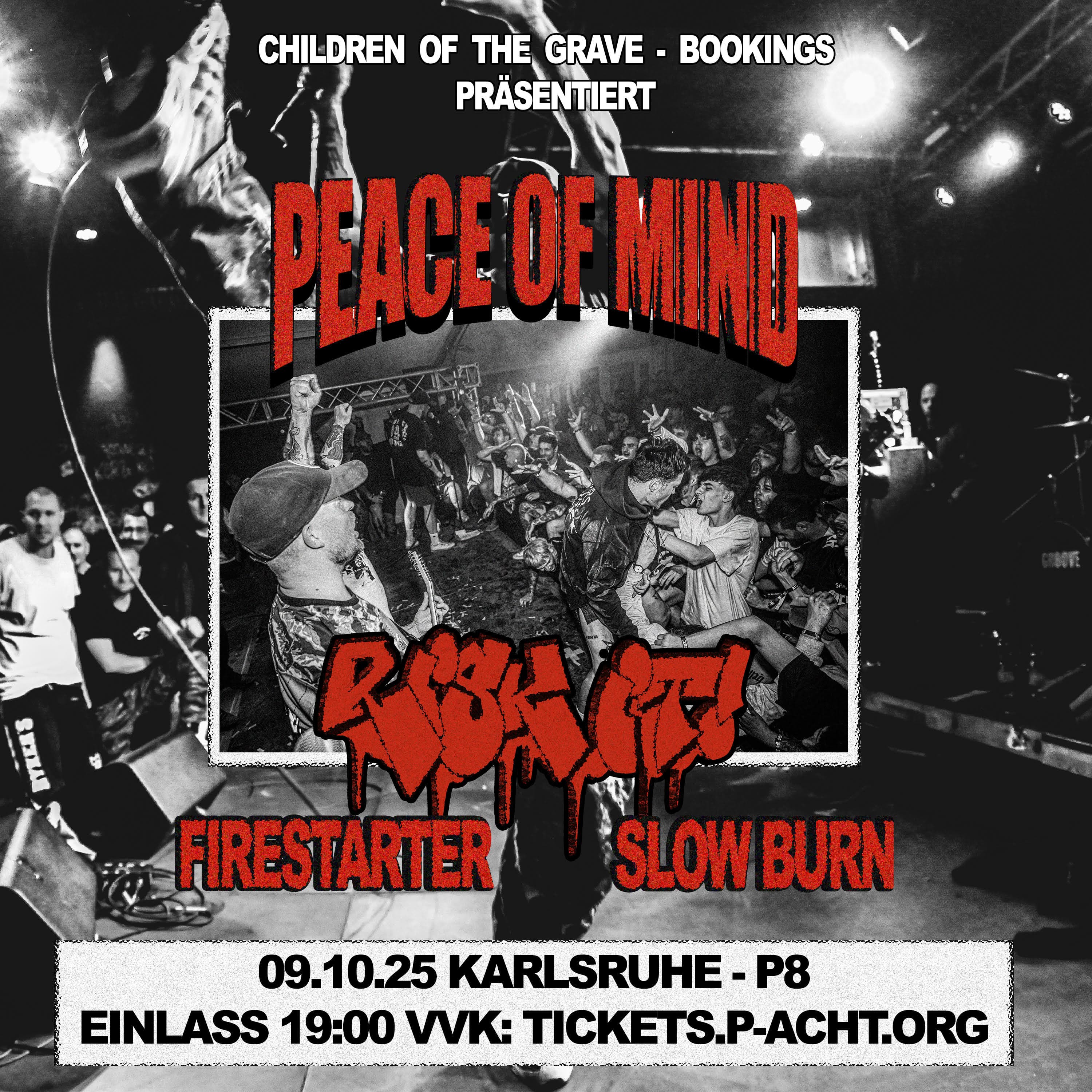 Unsere Freunde PEACE OF MIND lassen sich mal wieder im P8² blicken. Mit im Gepäck ist die neue, Anfang September veröffentlichte Platte "Blood Is The Price". Hier gibt's wie gewohnt kompromisslosen Hardcore mit derber Metalkante, technisch noch etwas ausgereifter und atmosphärisch aufgeladener als je zuvor. Eine Wucht! Unterstützt werden die Thüringer Headbanger von den Dresdner Hardcore-Veteranen RISK IT!, der Straight-Edge-Band FIRESTARTER aus Los Angeles und der ebenfalls aus Thüringen kommenden Groove-Granate SLOW BURN.