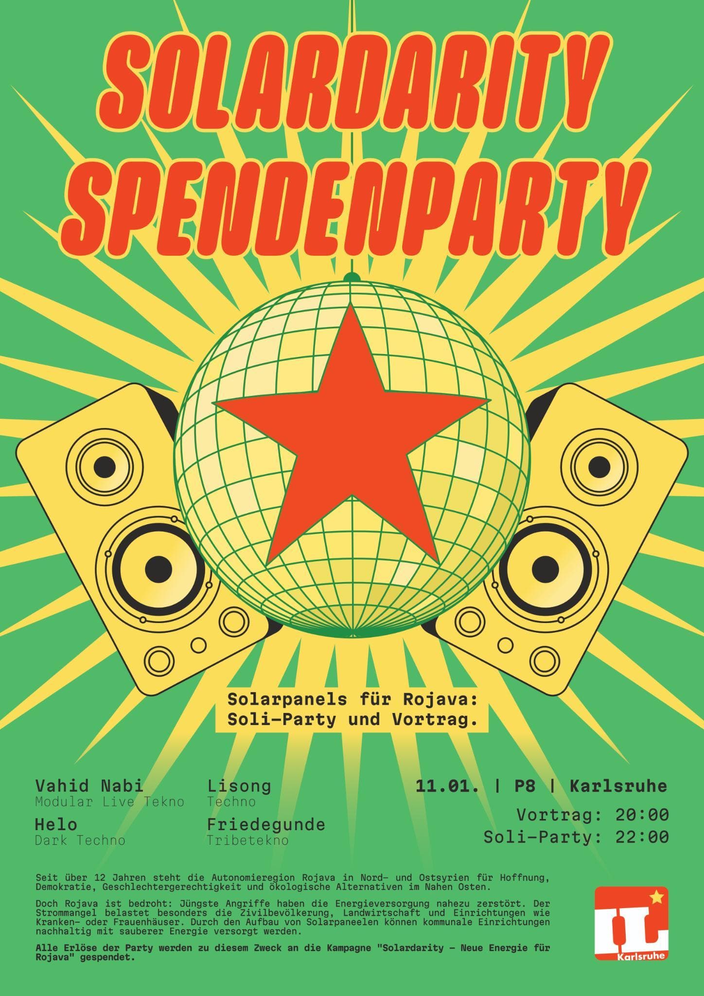 🌍 Vortrag zur Solardarity-Kampagne: Vor der Party geben wir euch Einblicke in die Initiative, die Rojava mit Energie versorgen will. Wir informieren über die Herausforderungen in der Region und wie wir gemeinsam eine demokratische, ökologische und geschlechtergerechte Alternative stärken können.