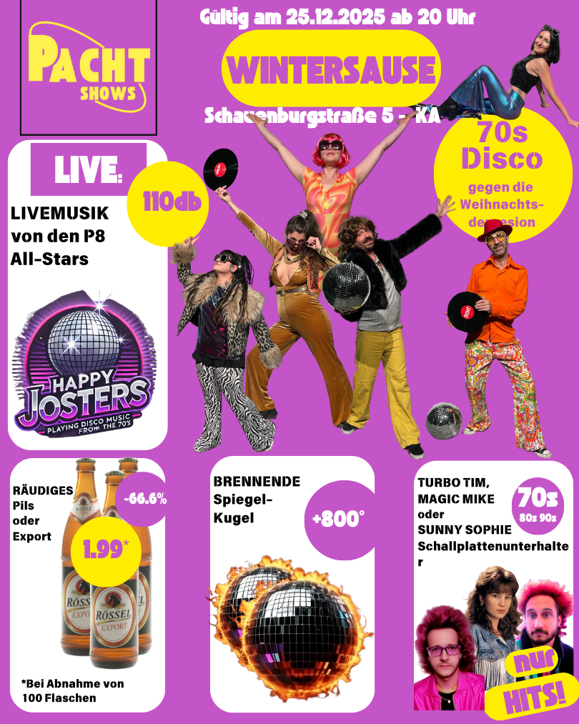 Auf die Ohren gibt es Livemusik von den exklusiven und frisch gegründeten P8 All Stars „The Happy Josters“! Diese Neuformation beglückt euch mit musikalischen Erzeugnissen im 70s Disco Stil, gespielt von engagierten Menschen aus der P8 höchstpersönlich.
